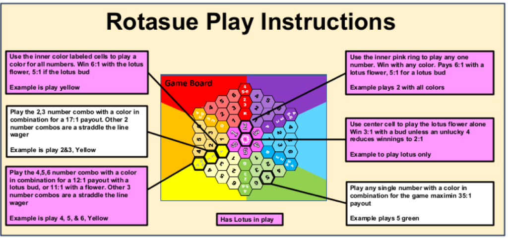 Play involves three dice with a brightly colored, eye catching gameboard. Once the wager is placed, the board is locked and the three dice are cast. The combination of three dice is played in unison (one is standard 1-6 numbered, one has six colors, the remaining die has 4 lotus flowers and 2 lotus buds)